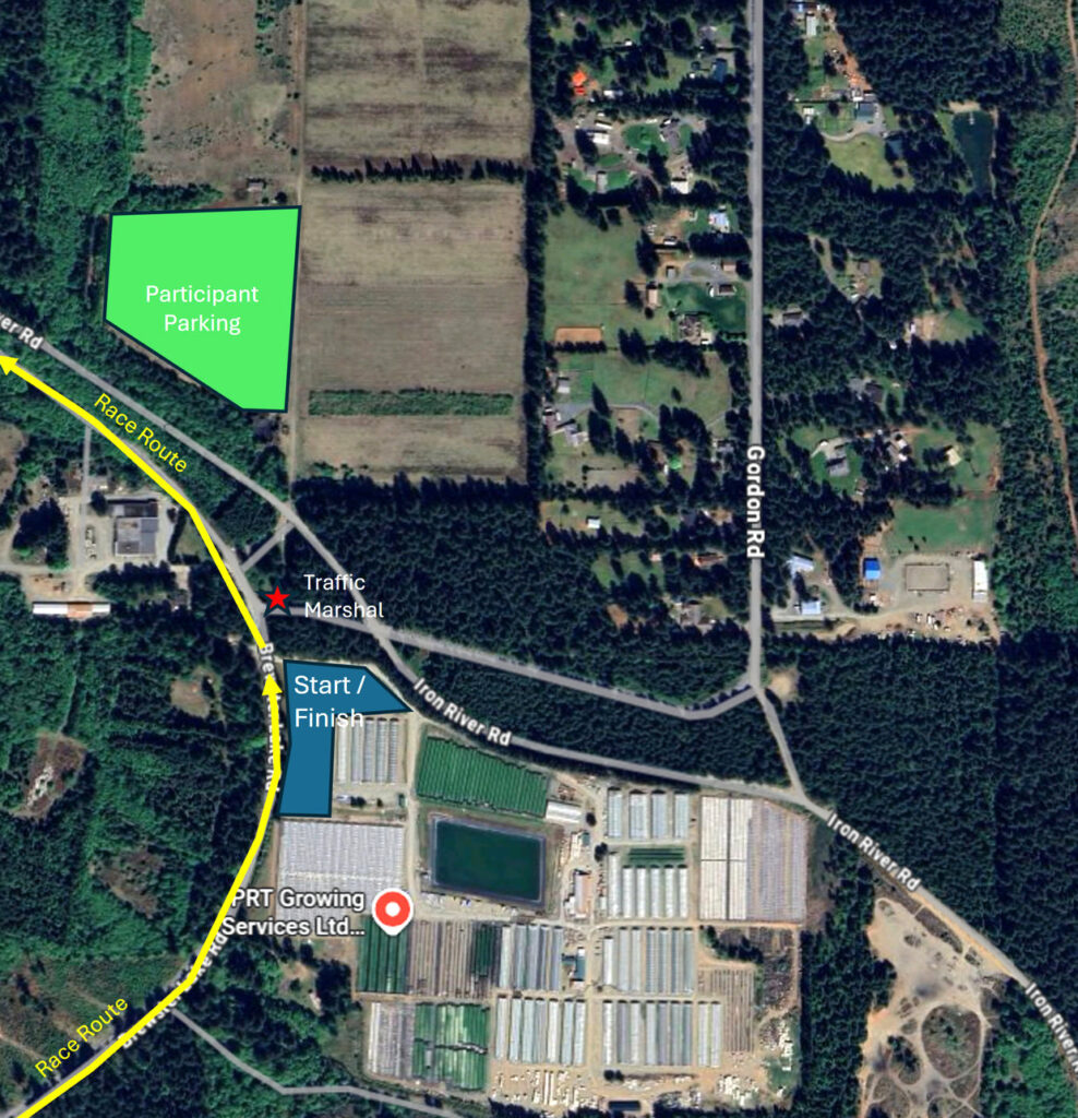 The event start/finish will be located at the PRT Growing Services Nursery located at 3820 Snowden Camp Rd in Campbell River. Follow Hwy 19 and head Northbound to Campbell River. Continue North to Duncan Bay and then turn left (WEST) on Duncan Bay Road.  Then turn left on Gordon Road and follow until you reach Brewster Lake Road.  Turn Right to enter the participant parking area.  Follow the Signs!